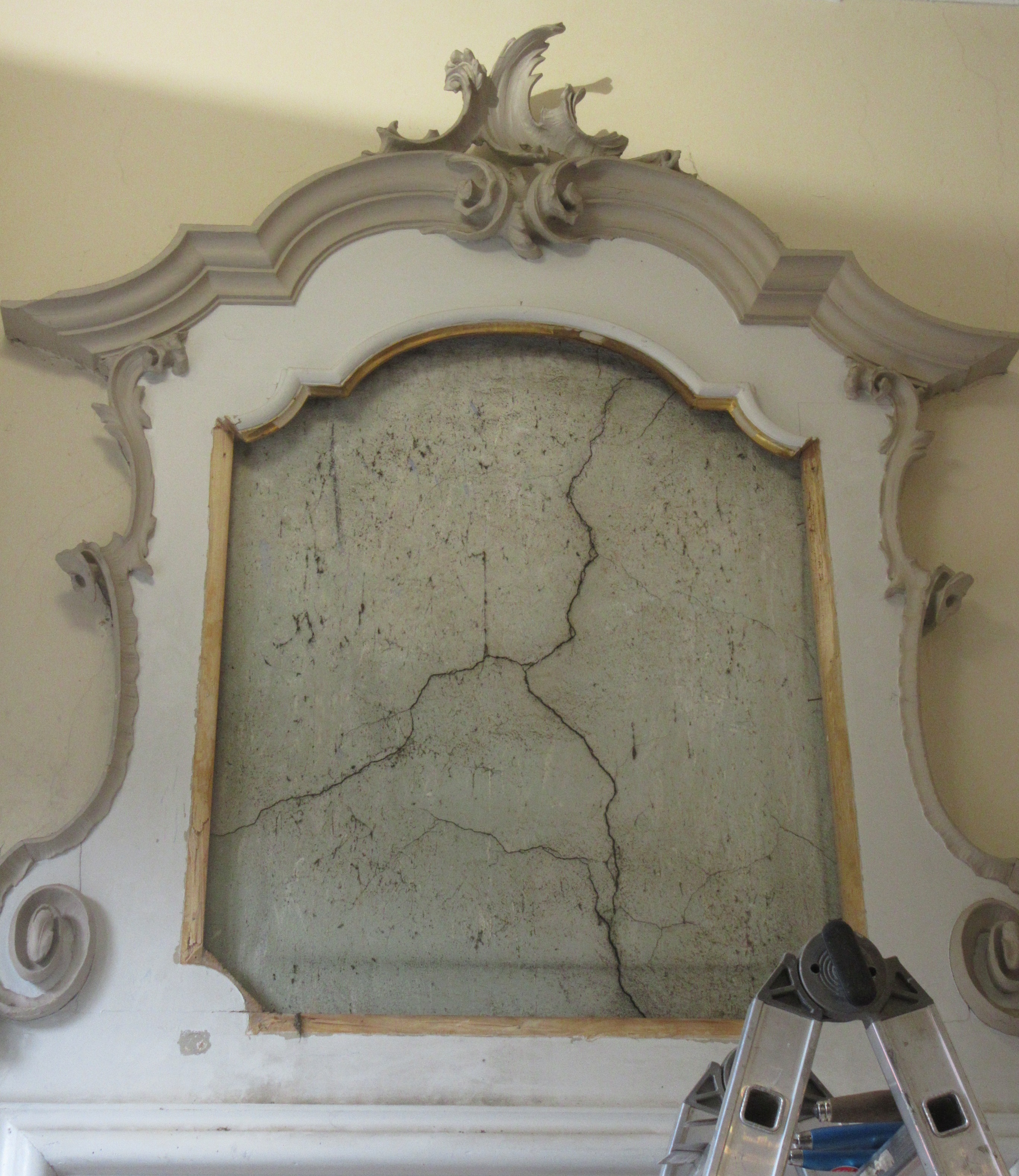 Il muro originale con tracce di precedenti colori Altre foto: Tre delle quattro sovrapporte Dopo la rimozione della cornice La rimozione della sovrapporta La rimozione della sovrapporta Retro della cornice con chiusura a chiave di legno Fronte e retro di una sovrapporta Coppia di colombi: prima fase di restauro Coppia di colombi: seconda fase di restauro Vaso con nasturzi e papaveri durante il restauro Vaso con nasturzi e papaveri: dettaglio Vaso con peonie, tulipani e iris durante il restauro Vaso con peonie, tulipani e iris: dettaglio Laghetto con putto, anfora e fiori durante il restauro Laghetto con putto, anfora e fiori: dettaglio