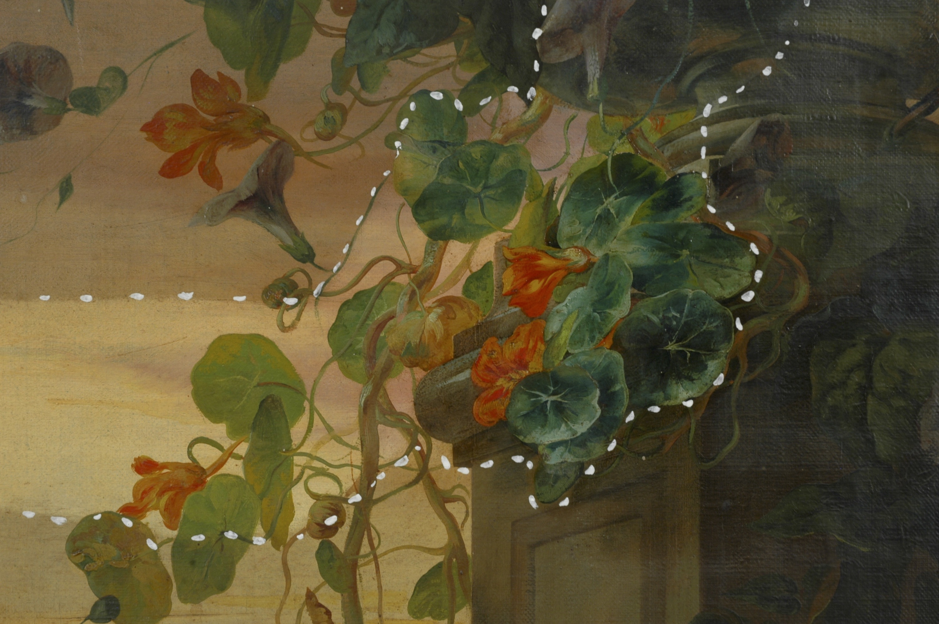 Vaso con nasturzi e papaveri: dettaglio Altre foto: Tre delle quattro sovrapporte Dopo la rimozione della cornice La rimozione della sovrapporta La rimozione della sovrapporta Il muro originale con tracce di precedenti colori Retro della cornice con chiusura a chiave di legno Fronte e retro di una sovrapporta Coppia di colombi: prima fase di restauro Coppia di colombi: seconda fase di restauro Vaso con nasturzi e papaveri durante il restauro Vaso con peonie, tulipani e iris durante il restauro Vaso con peonie, tulipani e iris: dettaglio Laghetto con putto, anfora e fiori durante il restauro Laghetto con putto, anfora e fiori: dettaglio