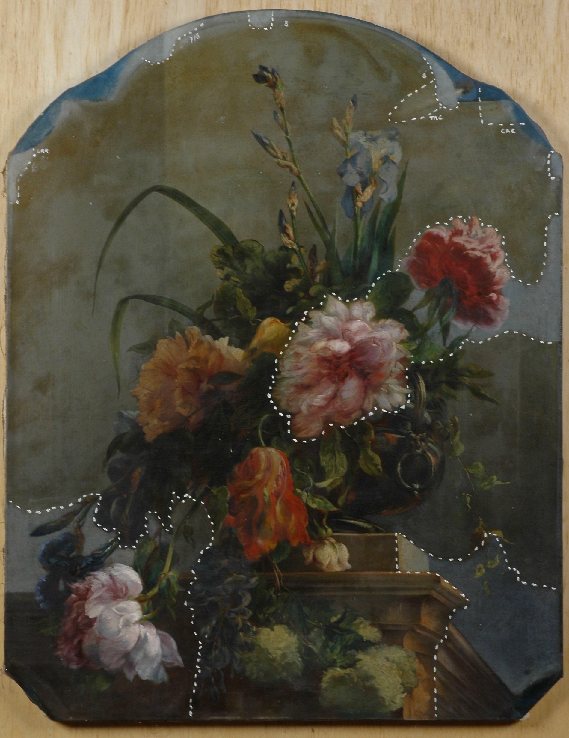 Vaso con peonie, tulipani e iris durante il restauro Altre foto: Tre delle quattro sovrapporte Dopo la rimozione della cornice La rimozione della sovrapporta La rimozione della sovrapporta Il muro originale con tracce di precedenti colori Retro della cornice con chiusura a chiave di legno Fronte e retro di una sovrapporta Coppia di colombi: prima fase di restauro Coppia di colombi: seconda fase di restauro Vaso con nasturzi e papaveri durante il restauro Vaso con nasturzi e papaveri: dettaglio Vaso con peonie, tulipani e iris: dettaglio Laghetto con putto, anfora e fiori durante il restauro Laghetto con putto, anfora e fiori: dettaglio