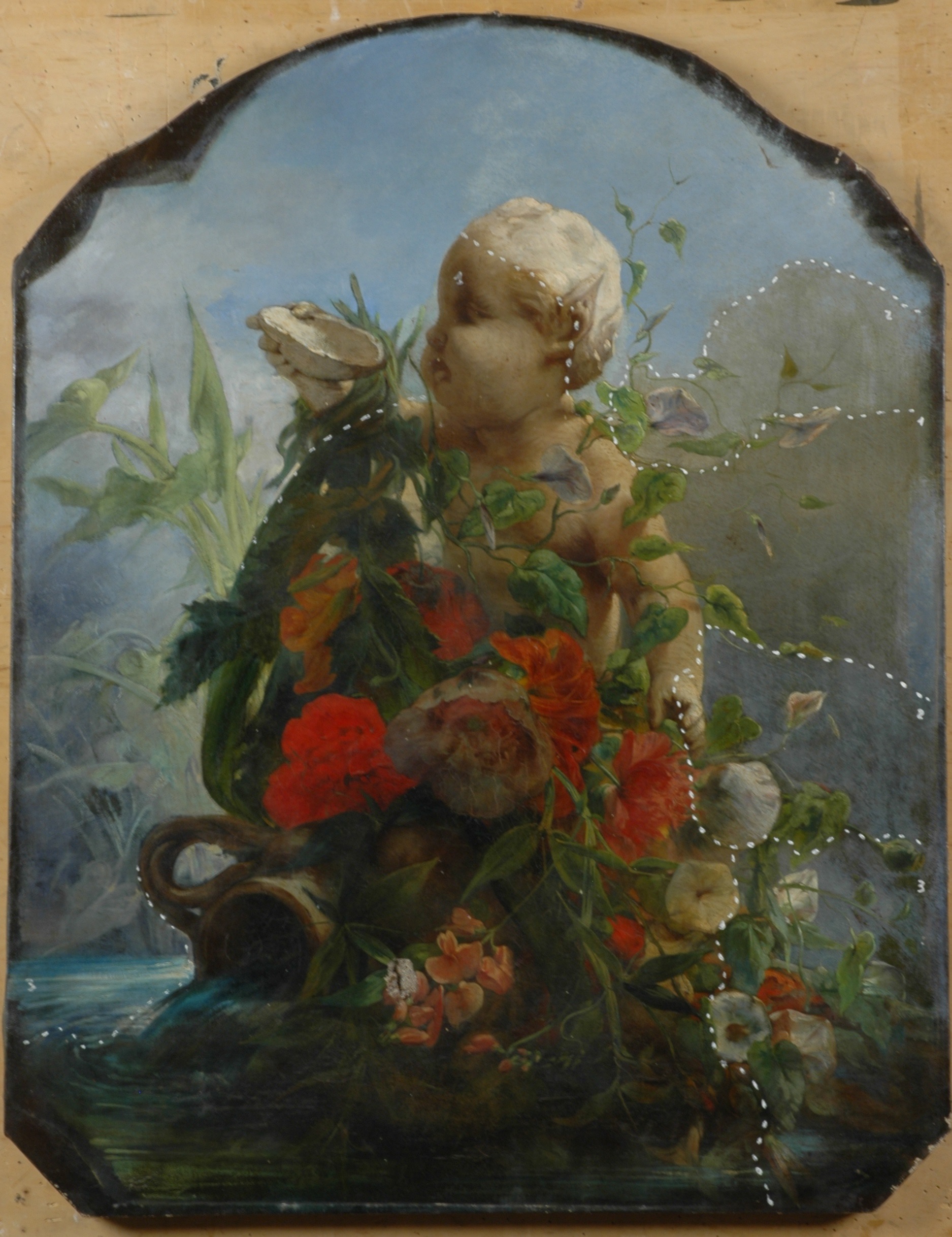 Laghetto con putto, anfora e fiori durante il restauro Altre foto: Tre delle quattro sovrapporte Dopo la rimozione della cornice La rimozione della sovrapporta La rimozione della sovrapporta Il muro originale con tracce di precedenti colori Retro della cornice con chiusura a chiave di legno Fronte e retro di una sovrapporta Coppia di colombi: prima fase di restauro Coppia di colombi: seconda fase di restauro Vaso con nasturzi e papaveri durante il restauro Vaso con nasturzi e papaveri: dettaglio Vaso con peonie, tulipani e iris durante il restauro Vaso con peonie, tulipani e iris: dettaglio Laghetto con putto, anfora e fiori: dettaglio